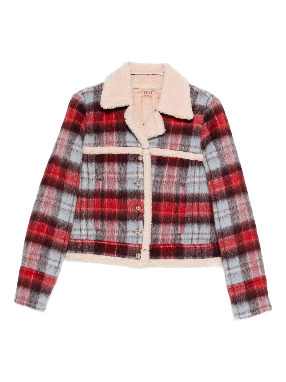 red and multicolour check pattern faux-shearling collar button fastening long sleeves