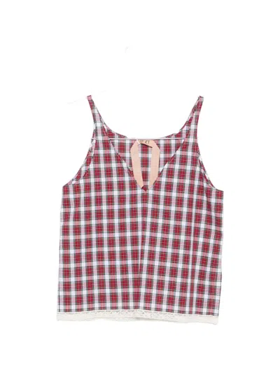red/white check pattern lace trim V-neck sleeveless