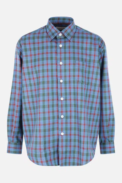 Namacheko shirt made of blue wool flannel with a multicolour check pattern. It features a pointed collar, button closure, chest patch pocket, long sleeves with buttoned cuffs, and a rounded hem.