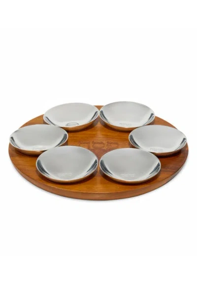Merge tradition and modernity with this Seder plate featuring a rich acacia-wood base and clean, minimalist lines. Six shining Nambé-alloy inserts are inscribed, in Hebrew and English, with the names of the ceremonial Seder foods. Acacia wood/Nambé alloy Hand wash Imported