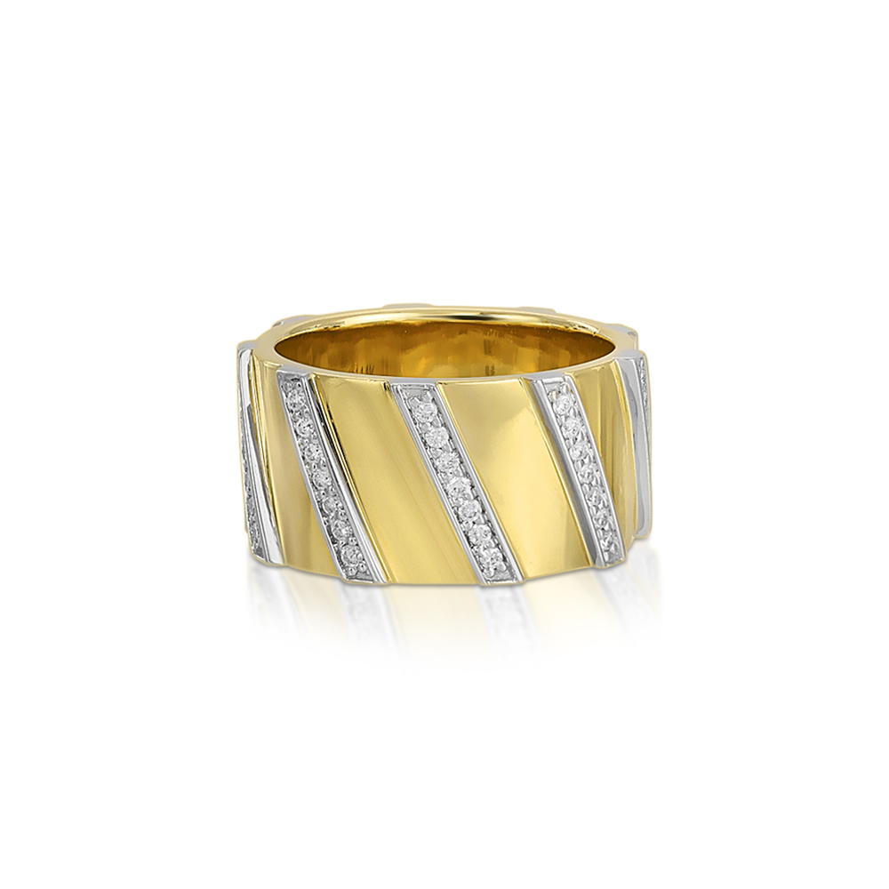 Nancy Newberg Diamond Striped Cigar Band in Yellow Gold/White Diamonds: Ready to ship in 2-4 weeks. Here, rows of white diamonds set in silver are striped diagonally along a thick 14-karat gold band. It’s an eye-catching design that somehow feels both classic and fresh. And it sets the stage nicely for mixed-metal pairings.14k yellow gold, 0.567 ctw white diamonds Made in USA.