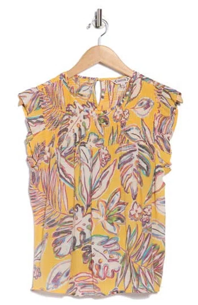 Fluttery sleeves give easy movement to a woven top detailed with soft smocking pleats to sweeten your look. 23" length (size Small) Back keyhole with button closure Flutter sleeves 65% rayon, 35% polyester Machine wash, tumble dry Imported