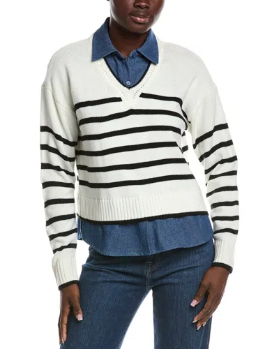 Introducing the Nanette Nanette Lepore Twofer Pullover, a chic and stylish addition to your wardrobe. This cozy pullover features a unique design with denim trim and a classic cannoli cream and black color/pattern. Made from 100% acrylic and 100% cotton combo, this pullover is both comfortable and versatile. With a length of approximately 24 inches from shoulder to hem, this pullover is perfect for layering or wearing on its own. Hand wash only. Imported. Get yours today and elevate your sweater game with Nanette Nanette Lepore!