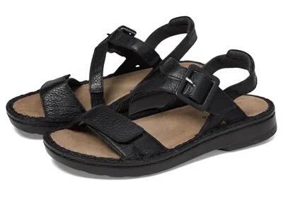 Naot Castelo - Women's Shoes : Soft Black Leather : ; APMA-approved and comfortable, the Naot Castelo sandals are an ideal choice for everyday wear. A part of the Utopia collection, these lightweight sandals offer a comfortable walking experience. The two hook-and-loop straps ensure a perfect fit while the polyurethane midsole cushions your steps. Effortlessly elevate your style and outfits by wearing these leather sandals. ; Leather upper. ; Removable cork and latex footbed and leather lining. ; Ankle strap with a buckle closure. ; Shock-absorbing and flexible arch support. ; Slip-on style. ; Open, round toe. ; Lightweight and durable polyurethane outsole. ; Imported. Measurements: ; Heel Height: 1 1 4 in ; Weight: 8 oz ; Platform Height: 1 in ; Product measurements were taken using size EU 38 (US Women's 7), width M. Please note that measurements may vary by size. | Naot Castelo Women's Shoes Soft Black Leather : EU 40 (US Women's 9) M