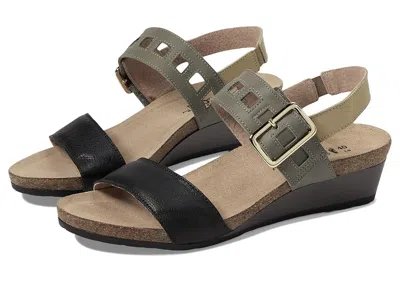 Naot Dynasty - Women's Shoes : Black/Gray/Beige Leather Combo : ; The Dynasty from Naot runs as a Narrow to Medium Width. ; Experience all-day comfort and dazzling style with the Naot Dynasty wedge. With an anatomic cork and latex footbed that is wrapped in pampering suede and molds to the shape of the foot with wear. ; Open-toe silhouette. ; Leather upper and lining with decorative buckle. ; Adjustable hook-and-loop strap. ; Polyurethane midsole. ; Molded wedge heel. ; Polyurethane outsole. ; Imported. Measurements: ; Heel Height: 1 1 4 in ; Weight: 7 oz ; Product measurements were taken using size EU 37 (US Women's 6), width M. Please note that measurements may vary by size. | Naot Dynasty Women's Shoes Black/Gray/Beige Leather Combo : EU 42 (US Women's 11) M