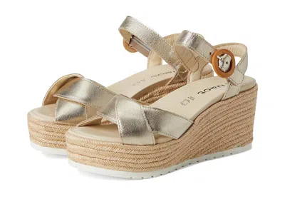 Naot Marbella - Women's Sandals : Radiant Gold Leather : ; Introducing Marbella- a symbol of comfort and elegance. This sandal features padding for enhanced comfort and a distinctive wood accent buckle closure, combining luxurious aesthetics with practicality. Ideal for both casual and dressy occasions, Marbella promises style and comfort in every step, making it a must-have addition to your footwear collection. Crafted with Naot's anatomic cork and latex footbed wrapped in smooth leather, these shoes mold to the shape of your foot with wear, ensuring personalized comfort. The Costal Collection's EVA sole offers the look of a 3-inch wedge without the discomfort, providing both style and stability with every step. ; Leather upper and lining. ; Open, round toe silhouette. ; Polyurethane outsole. ; Imported. Measurements: ; Heel Height: 3 1 2 in ; Weight: 9.5 oz ; Product measurements were taken using size EU 37 (US Women's 6), width M. Please note that measurements may vary by size. | Naot Marbella Women's Sandals Radiant Gold Leather : EU 40 (US Women's 9) M