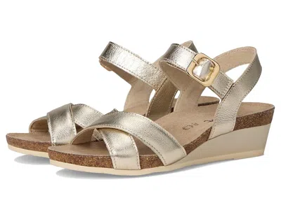 Naot Throne - Women's Shoes : Radiant Gold Leather : ; Each Naot shoe is handmade with the finest and highest quality raw materials. ; Let your feet enjoy a luxurious feel in sumptuous style as you wear the Naot Throne Wedge Heels. This almond toe pair features leather upper and lining construction with cork and latex covered in suede footbed. The ankle strap has hook-and-loop closure with decorative buckle design. ; Wedge heels. ; Polyurethane midsole and outsole. ; Made in Israel. Measurements: ; Heel Height: 1 3 4 in ; Weight: 7.2 oz ; Platform Height: 1 in ; Product measurements were taken using size EU 38 (US Women's 7), width M. Please note that measurements may vary by size. | Naot Throne Women's Shoes Radiant Gold Leather : EU 40 (US Women's 9) M