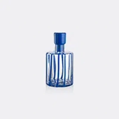 NasonMoretti's joyful collection of murano glass vessels celebrates the circus in a troupe of striped designs. Brightening up tables, this otherwise simple and sturdy bottle is dressed with pigmented filaments of color in painterly blue stripes. An opaque blue stopper, handmolded by the Venetian glass master, completes this design, which creates an atmosphere of stylish spontaneity. The artisanal nature of the piece makes each 'Cyrcus' bottle subtly unique. Mix and match with colored glasses from the series for a spectacular effect.
