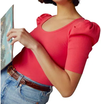 A versatile blouse that works from desk to dinner!Introducing the Pixie Scoop Neck Tee by Nation LTD, a chic addition to your wardrobe. This vibrant red tee features a scoop neckline with bold shoulders and short sleeves, crafted from a soft ribbed knit cotton blend with slight stretch. Composition - 95% Cotton, 5% Spandex. Origin - Made in Peru. Closure - Pull-on style. Care - Machine washable.