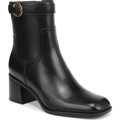 A buckled ankle strap and decorative welt stitching add equestrian-inspired elements to a leather bootie lifted by a subtly flared, stacked heel. Contour+ Comfort technology offers pressure distribution, less fatigue and longer wear. 2 1/4" heel 5" shaft Side zip closure Cushioned footbed with Contour+ Comfort technology Leather upper/textile lining/synthetic sole Imported