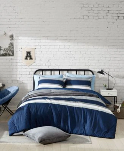 Get back to school ready this year with Nautica's Heathered Block comforter set. Making it easy to transition into the dorm with a heathered texture that is printed throughout varying weights of striping in navy blue, gray and white with pops of light blue. The brushed microfiber is designed for a relaxed and casual sensibility to provide that at home comfort feel. With a 6 ounce polyester fill, the comforter is great for year round use plus easy to care for as all are machine washable.