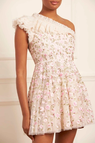 NEEDLE & THREAD Posy Pirouette One-shoulder Micro Mini Dress In Champagne