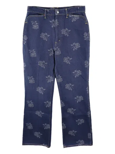 indigo blue front button and zip fastening belt loops two side slash pockets two rear patch pockets