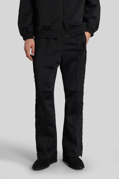 Pants in black polyester, waist elastic band, side pockets with zip, side embroidered logo, fringe, 51% polyester, 49% rayon, Made in Japan, the models is 1.91 and wears size M