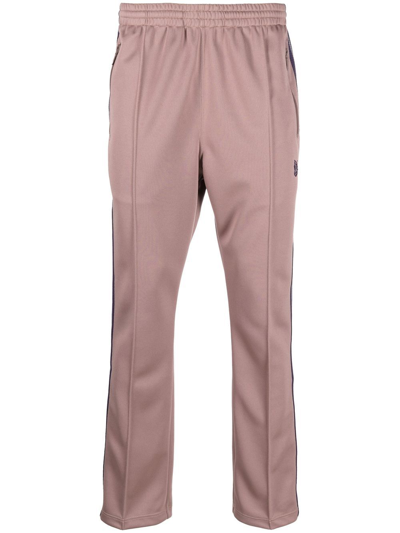 logo-embroidered track pants from NEEDLES featuring taupe, purple, signature butterfly detailing, exposed-seam detailing, side stripe detailing, elasticated waistband, two side zip-fastening pockets, rear zip-fastening pocket and straight leg.