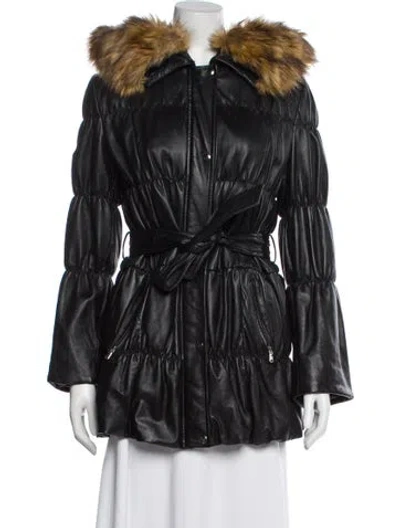 Neiman Marcus Leather Jacket Black With Hood Faux Fur Trim & Stand Collar Zip Pockets & Zip Closure Fit: Jackets by Neiman Marcus typically fit true to size. | Neiman Marcus Leather Jacket in Black, Women's L