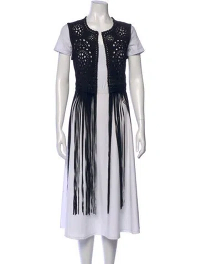 Cusp by Neiman Marcus Leather Cardigan Black Printed Fringe & Eyelet Accents Sleeveless with Crew Neck | Cusp by Neiman Marcus Leather Printed Sweater in Black, Women's XS