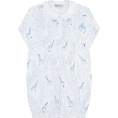 The Blue Giraffe Print baby converter gown is a true game-changer for parents! It allows for a quick and effortless transition from a cozy gown for sleepy time to a practical playsuit for playtime, simply by changing the snaps. 100% Pima Cotton Wash before use Machine wash cold with like colors Do not tumble dry Gentle cycle. Warm iron if needed.