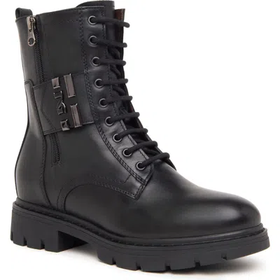 Polished logo hardware highlights the decorative strap of a lug-sole bootie that perfectly balances utilitarian and sophisticated style. 1 1/4" heel Lace-up style; side zip closure Leather upper and lining/synthetic sole Imported