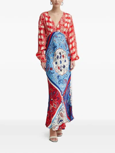 red mixed print V-neck long-sleeve frilled cuffs maxi length