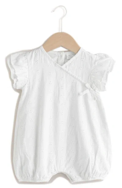 Eyelet embroidered details keep your little one's look sweet in this wrap-style romper crafted from crisp cotton with snaps between the legs for easy changing. Ties at side; snaps between legs 100% cotton Machine wash, tumble dry Imported