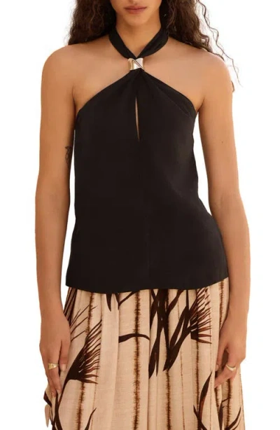 An adjustable tie dangles at the back of this skin-showing halter top accented with high-shine hardware. Halter neck 84% modal, 16% recycled polyester Machine wash, line dry Imported
