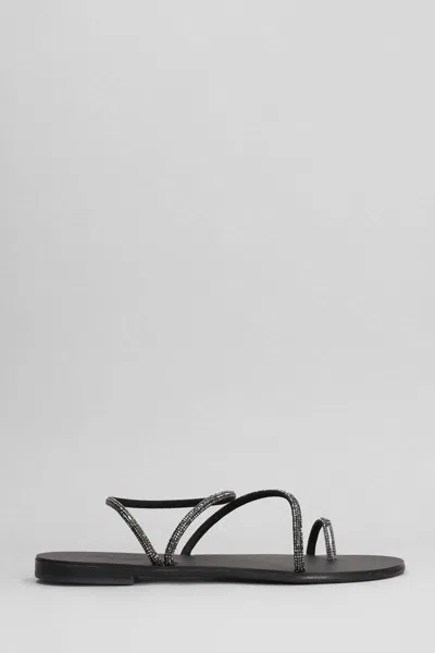 Flats in black leather, anklet, open toe, tubular straps, strass detail, rubber sole, 100% leather, Made in Greece