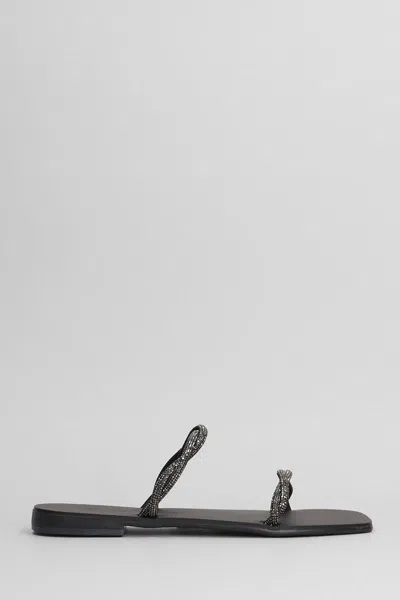 Flats in black leather, square toe, slip on, ring detail, woven band, tubular straps with crystals, rubber sole, 100% leather, Made in Greece