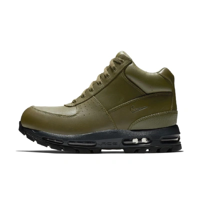 PREMIUM WATERPROOF STYLE The Nike Air Max Goadome Men's Boot features a full-grain, waterproof leather upper and full-length Max Air unit for total comfort, whatever the conditions or terrain. Weather ProtectionThe waterproof, full-grain leather upper repels water to help keep you dry and comfortable in inclement weather. CushioningThe visible, full-length Max Air unit provides lightweight cushioning and impact protection. DurabilityStrategically placed overlays and reinforced eyelets offer long-lasting wear while the All-Trac rubber outsole delivers enhanced durability and excellent grip on a variety of surfaces. More Details Gusseted tongue to help keep debris out of the boot Mid-cut upper for ankle support and comfort Perforations for increased ventilation Toe bumper wraps up the front for added protection Aggressive lug pattern for traction Style: 865031;Color: Olive Canvas/Anthracite/Black/Olive Canvas; Size: 7.5; Gender: Male