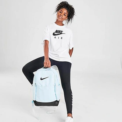 Nike Swoosh graphics at front Haul loop at top Padded adjustable straps and quilted back panel for comfortable carrying Durable, heavyweight 100% polyester Zippered main compartment, interior zip storage, small front zip pocket Dimensions: 18 H x 12 W x 7 D The Nike Brasilia Medium Training Backpack is imported. Securely store your gear and get a stylish look in the Nike Brasilia Medium Training Backpack. Color: Blue. Gender: unisex. Age Group: adult. Nike Brasilia Medium Training Backpack in Blue/Glacier Blue 100% Polyester