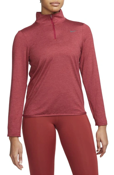 Whether it's a chill in the air or powerful rays, this easy-fitting 1/4-zip top is ready to support you on your run. Sweat-wicking tech helps keep you comfortable and dry, and UV protection adds extra coverage so you can feel confident as you log your daily miles. Benefits: Nike Dri-FIT technology moves sweat away from your skin for quicker evaporation, helping you stay dry and comfortable. Zip pocket on left hip holds your essentials. Thumbholes let you extend your coverage and help hold the sleeves in place while you move. Product Details: 88% polyester/12% spandex. Machine wash. Imported. This product provides UVA and UVB protection from the sun only in the areas covered by the garment. To protect exposed areas, the use of good quality sunscreen is recommended. Reflective elements. Not intended for use as Personal Protective Equipment (PPE). Style: FB4316; Color: Noble Red/Cedar/Heather; Size: 2XL; Gender: Female; Age Group: Adult | Nike Dri-FIT Swift Element UV Women's 1/4-Zip Running Top in Red, Size: 2XL | FB4316-620