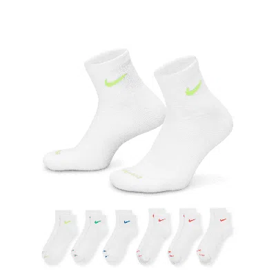 COMFORT PLUS SUPPORT. The Nike Everyday Plus Cushioned Socks bring comfort to your workout with extra cushioning under the heel and forefoot and a snug, supportive arch band. Sweat-wicking power and breathability up top help keep your feet dry and cool to help push you through that extra set. Benefits:Cushioning under the forefoot and heel helps soften the impact of your workout. Dri-FIT technology helps your feet stay dry and comfortable. Band around the arch feels snug and supportive. Breathable knit pattern on top adds ventilation. Reinforced heel and toe are made to last. Product Details:Fabric (heather): 62% cotton/35% polyester/2% spandex/1% nylon. Fabric (solid): 68% cotton/29% polyester/2% spandex/1% nylon. Machine wash. Imported. Style: SX6899; Color: Multi-Color; Size: S; Gender: Male; Age Group: Adult | Nike Everyday Plus Cushioned Training Ankle Socks (6 Pairs) in Multi-Color, Size: Small | SX6899-968