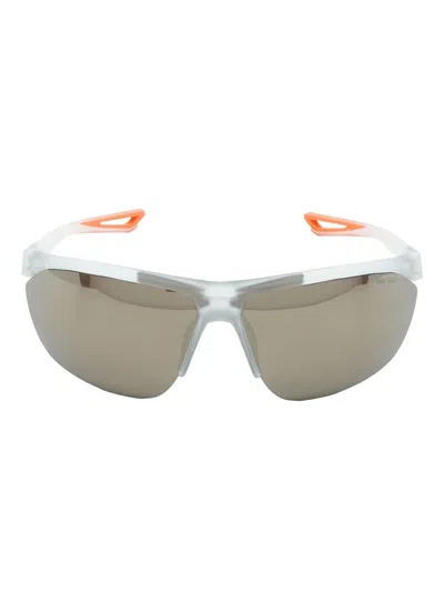 white biker-style frame tinted lenses straight arms These glasses come with a protective case.