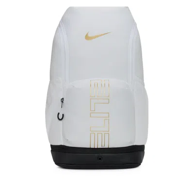 Basketball-sized main compartment Exterior zippered pocket for storage of small essentials Bottom compartment separates dirty clothes and shoes post-play Internal laptop compartment and expandable side pockets Trolley sleeves allows for easy attachment to travel luggage Air Max unit-padded and adjustable shoulder straps Internal laptop compartment 12" W x 19" H x 9" D. 32L capacity 100% polyester Spot clean The Nike Varsity Hoops Elite Backpack (32L) is imported. Whether it's a friendly pick-up game or an intense 3-on-3 tourney, this Nike Varsity Hoops Elite Backpack (32L) will come in handy. With a surplus of storage space that can even hold the "rock," shoulder straps embedded with Air Max tech for extra comfort, and sleek ELITE branding, this pack is an essential player on the team. Nike Varsity Hoops Elite Backpack (32L) in White/Black/Metallic