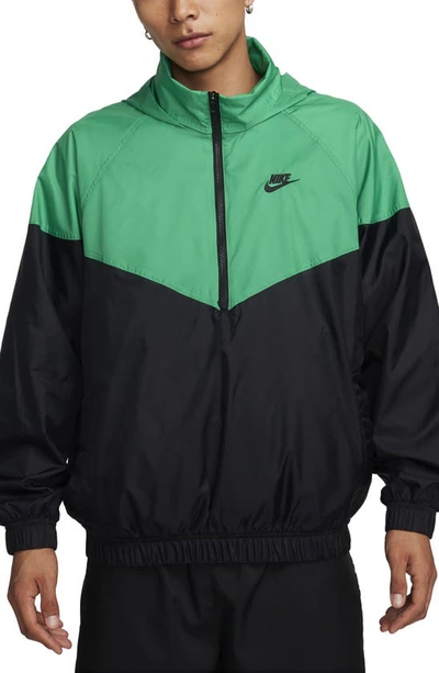 VERSATILE POP-OVER PERFECTION. This track-inspired anorak is your next "wear anywhere, do anything" jacket. The packable hood folds under the collar to keep it concealed when you don't need it. An oversized fit gives you plenty of space to layer up during cooler temps or wear it with a tee for a breezy feel when the weather warms. Classic stitched chevron angle on the chest nods to the Windrunner, our iconic track jacket. Lightweight, Dry Finish: Soft woven fabric is lightweight, water-repellant and feels silky smooth on your skin. Versatile Design: 1/2-zip design lets you pop it on and off and change up your style with ease. Ready to Move: Elastic hem and cuffs help hold the jacket in place when you move. Product Details: 1/2-zip design. Front welt pockets. Embroidered Futura logo on left chest. Elastic cuffs and hem. Body: 100% nylon. Mesh: 100% polyester. Machine wash. Imported. Style: DQ4910; Color: Stadium Green/Black/Black; Size: L; Gender: Male; Age Group: Adult | Nike Sportswear Windrunner Men's Unlined Woven Anorak in Green, Size: Large | DQ4910-324