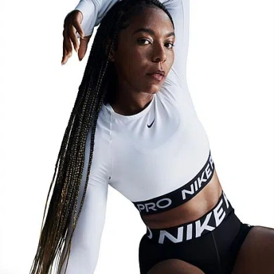 Size & Fit Tight, body-hugging fit Cropped length Product Features Form-fitting, flexible active lifestyle crop top with Nike Swoosh logo at center chest and Nike Pro tape logo bottom band Elasticized jacquard band at hem with thumbholes for extended coverage and comfortable, stay-put fit Nike Dri-FIT technology for moisture management during high-intensity activity 83% Polyester and 17% Spandex. Machine wash The Nike Pro 365 Dri-FIT Cropped Long-Sleeve T-Shirt is imported. This Women's Nike Pro 365 Dri-FIT Cropped Long-Sleeve T-Shirt is a sleek, stretchy, and form-fitting shirt made with a flexible poly-spandex fabric that allows you to move freely and naturally. An elastic Nike Pro bottom band and thumbholes help hold this cropped training top in place, while Dri-FIT keeps sweat from slowing down your training session.