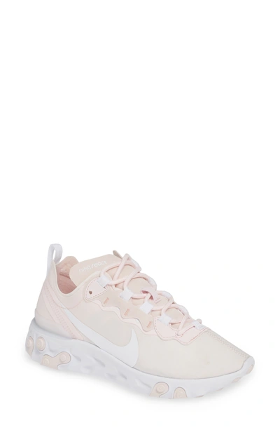 These pink React Element 55 sneakers from Nike borrow design lines from heritage Nike runners like the Internationalist, add reflective graphics and then places it all on Nike React technology. The pair features a round neck, a lace-up front fastening, a signature Nike swoosh, a pull tab at the rear, a rubber sole and a lightweight textile upper. The Nike React technology delivers an extremely smooth ride, while the rubber pods on the midsole/outsole provide durable traction.