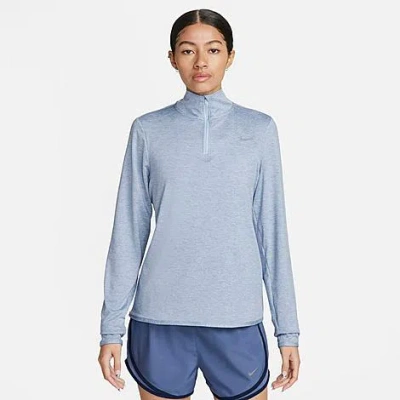 Whether it's a chill in the air or powerful rays, this easy-fitting 1/4-zip top is ready to support you on your run. Sweat-wicking tech helps keep you comfortable and dry, and UV protection adds extra coverage so you can feel confident as you log your daily miles. Benefits: Nike Dri-FIT technology moves sweat away from your skin for quicker evaporation, helping you stay dry and comfortable. Zip pocket on left hip holds your essentials. Thumbholes let you extend your coverage and help hold the sleeves in place while you move. Product Details: 88% polyester/12% spandex. Machine wash. Imported. This product provides UVA and UVB protection from the sun only in the areas covered by the garment. To protect exposed areas, the use of good quality sunscreen is recommended. Reflective elements. Not intended for use as Personal Protective Equipment (PPE). Style: FB4316; Color: Light Armory Blue/Ashen Slate/Heather; Size: 2XS; Gender: Female; Age Group: Adult | Nike Swift Element Women's UV Protection 1/4-Zip Running Top in Blue, Size: 2XS | FB4316-440