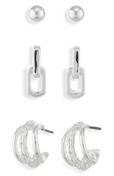 Enhance your ear stack with this trio of studs and hoops that can be worn together or separate for a solo statement. Pack of three assorted earrings Post back Silvertone plate Imported