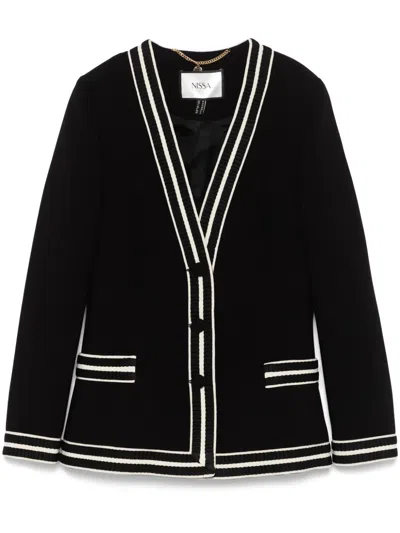 black front button fastening two front patch pockets shoulder pads long sleeves