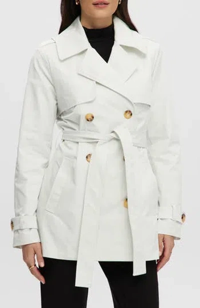 A soft waist-tie belt refines the classic double-breasted trench coat cropped just past the hips for a stylish and practical layer against wet weather. 30" length (size Small) Double-breast button front closure Soft-tie waist belt Long sleeves with adjustable straps Notch collar Two front slip pockets 100% polyester Machine wash, line dry Imported