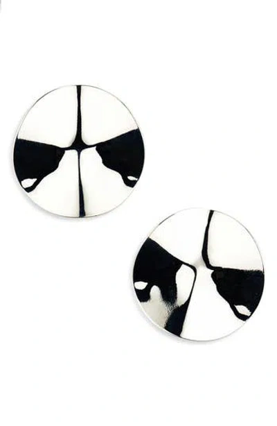Bring a future-forward finish to your look with these statement stud earrings featured in a glossy, liquid-like polish. 1 7/8" diameter Silvertone plate Post back Imported