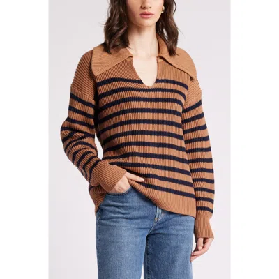NORDSTROM Stripe Long Sleeve Cotton Sweater In Tan- Navy Stripe