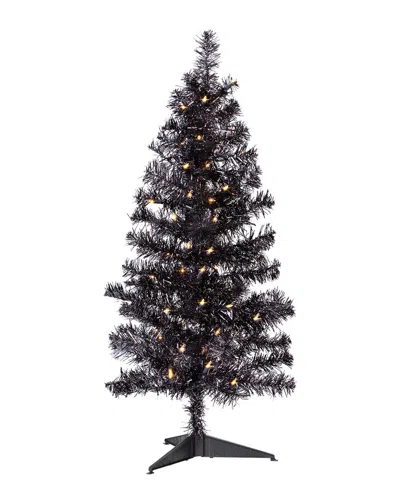 Color/Finish: Black Design Details: Enhance Your Festivities With A Dash Of Sophistication And Mystery By Adorning Your Space With This Delightful Tinsel Tree. This Tree Boasts Solid Black Shimmering Tinsel Branches Adorned With Clear Incandescent Mini Lights Casting A Magical Glow In Any Room. Complete With A Complimentary Solid Black Plastic Tree Stand. Its Ideal For Both Christmas And Halloween Decorating. Bring A Touch Of Elegance And A Hint Of Spookiness To Your Indoor Space With This Unique And Versatile Tree. Product Features: Pre-Lit With 50 Clear Lights. Bulb Size: Mini - 2.5V. Bulb Type: Incandescent. 80 Tips. 2.5 Wide Tapered Tips. 38 Blue Lead Cord. Additional Product Features: Medium Profile Tree. Ul Certified And Approved. For Indoor Use Only. If One Bulb Burns Out The Rest Will Stay Lit. No Assembly Required Tree Comes In 1 Piece. Comes With Replacement Bulbs And Spare Fuses. Comes With A Free Plastic Tree Stand. Wire Gauge: 22. 120 Volts 60 Hertz.17 Amps 20.4 Watts. Measurements: 36In X 15In X 15In Voltage/Battery Info: 120 Volts Polyvinyl Chloride (Pvc) Spot Clean Imported