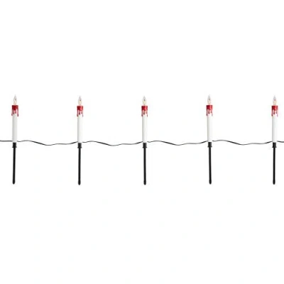Illuminate your Halloween night with an eerie glow that guides your way through the darkness. Our flickering flame pathway marker lights capture the mystique of flickering candle flames, casting an enchanting ambiance along your haunted path. Featuring white candles adorned with the illusion of red melting wax, these lights add a spooky yet elegant touch to your Halloween decor. Dare to venture forth and let these lights lead you into a realm where the line between reality and the supernatural blurs.Product Features:Halloween candle pathway markersDesigned with "flickering flame"Showcases the look of red melting candle waxColor: clear flicker bulbs/black wireSpacing between each candle: 12"Lighted length: 4'Total length: 5'6" black lead cord6" tail cordAdditional Product Features:Comes with 8.5" black ground stakesLight assembly requiredUL certified and approved for indoor or outdoor useContains end-to-end connectors which allows you to connect multiple sets together (not to exceed 210 watts) Wire gauge: 22120 volts, 60 hertz, 0.08 amps, 9.6 wattsDimensions: Candle only: 7" high x 1" diameterCandle with ground stake: 15.25" high x 1" diameterMaterial(s): plastic/glass bulbs/wireNote:Note: Lights are attached and cannot be used separately 5 count flickering candle pathway markers Features flicking flames; look of red melting candle wax End to end connectors allow you to connect multiple sets together; not to exceed 210 watts Ground stakes included; UL listed for indoor and outdoor use