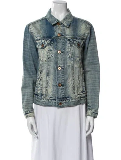 NSF Denim Jacket Blue Embroidered & Distressed Accents Pointed Collar Slit Pockets & Button Closure Fit: Jackets by NSF typically fit true to size. | NSF Denim Jacket in Blue, Women's M