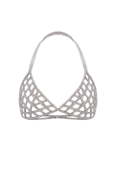 This exquisite triangle bra is meticulously handcrafted from Nué signature rhinestone cords and adorned with mirror-encrusted details for a stunning effect. Fully lined for comfort, it features a secure hook-and-eye fastening at the back.Composition: Rhinestones, Acrylic MirrorsLining: 100% SilkModel wears XS | Height: 178 cm