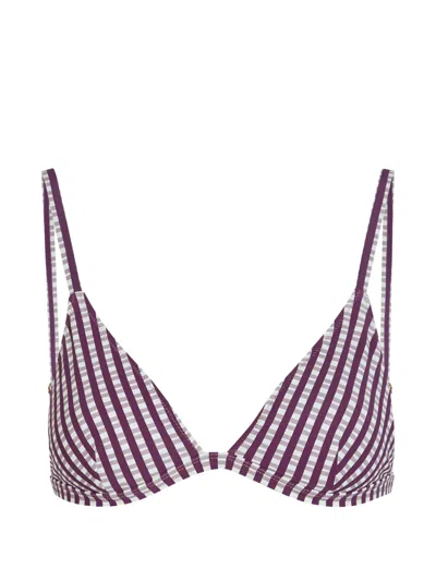 purple check pattern triangle cups adjustable shoulder straps rear clasp fastening tonal topstitching