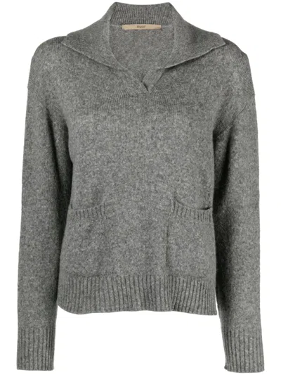 medium grey merino wool blend fine knit sailor collar V-neck drop shoulder long sleeves two front patch pockets ribbed cuffs and hem