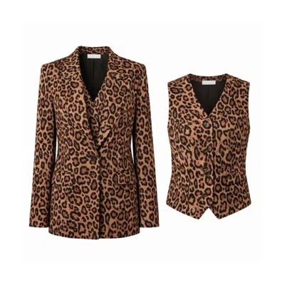 Designed for a modern and confident look, this leopard print jacket and vest set makes a bold style statement. Suitable for both daytime and evening wear, the inner vest design offers a comfortable yet eye-catching silhouette that stands out effortlessly. Featuring the timeless appeal of leopard print, this coordinated jacket and vest combination is a versatile choice for a variety of styling options. With its lined interior and high-quality fabric, it blends comfort with refined elegance, making it a standout addition to any wardrobe. Design: Two-piece set – Jacket & Vest Cold Wash Only / No Tumble Dry / Dry Clean Elastane 5%, Polyester 95%